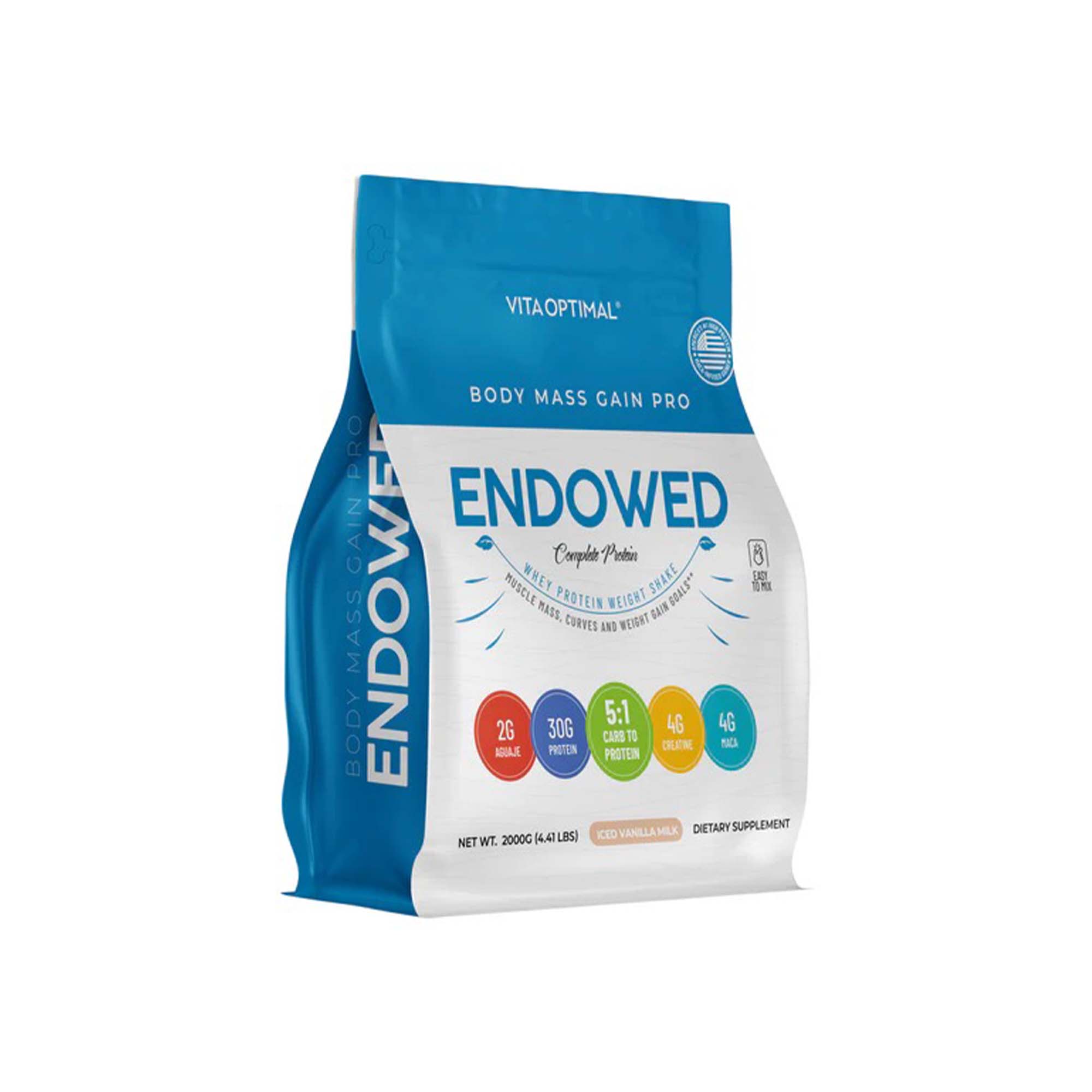 Introducing ENDOWED BODY MASS GAIN PRO – now in a big 4.4lb (2kg) resealable pouches, ideal for anyone seeking to build muscle mass, enhance glutes, improve body composition, increase strength, and achieve their body goals naturally. Our blend combines quality Whey protein and carbohydrates with potent ingredients like Maca, Creatine, Aguaje and BCAAs, to support your weight gain goals and help you bulk up in all the right places. Plus, it’s loaded with Zinc, Vitamin C, and Thiamine to support appetite, immune health, and skin health. Delicious Iced Vanilla Milk Flavor – a smooth, refreshing twist on classic vanilla.