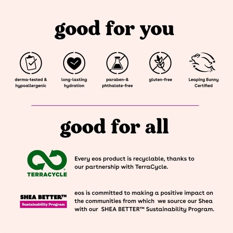 Protect and moisturize your skin with 7 nourishing oils + butters, including natural shea butter and shea oil. Our collection of incredible fragrances will delight in application and last all day on skin. eos products have wild grown, sustainably-sourced 100% natural shea butter to make skin feel moisturized, protected and soft. We are paraben, phthalate and gluten free. Dermatologist tested. Vegan. Hypoallergenic. PETA certified. No products tested on animals.