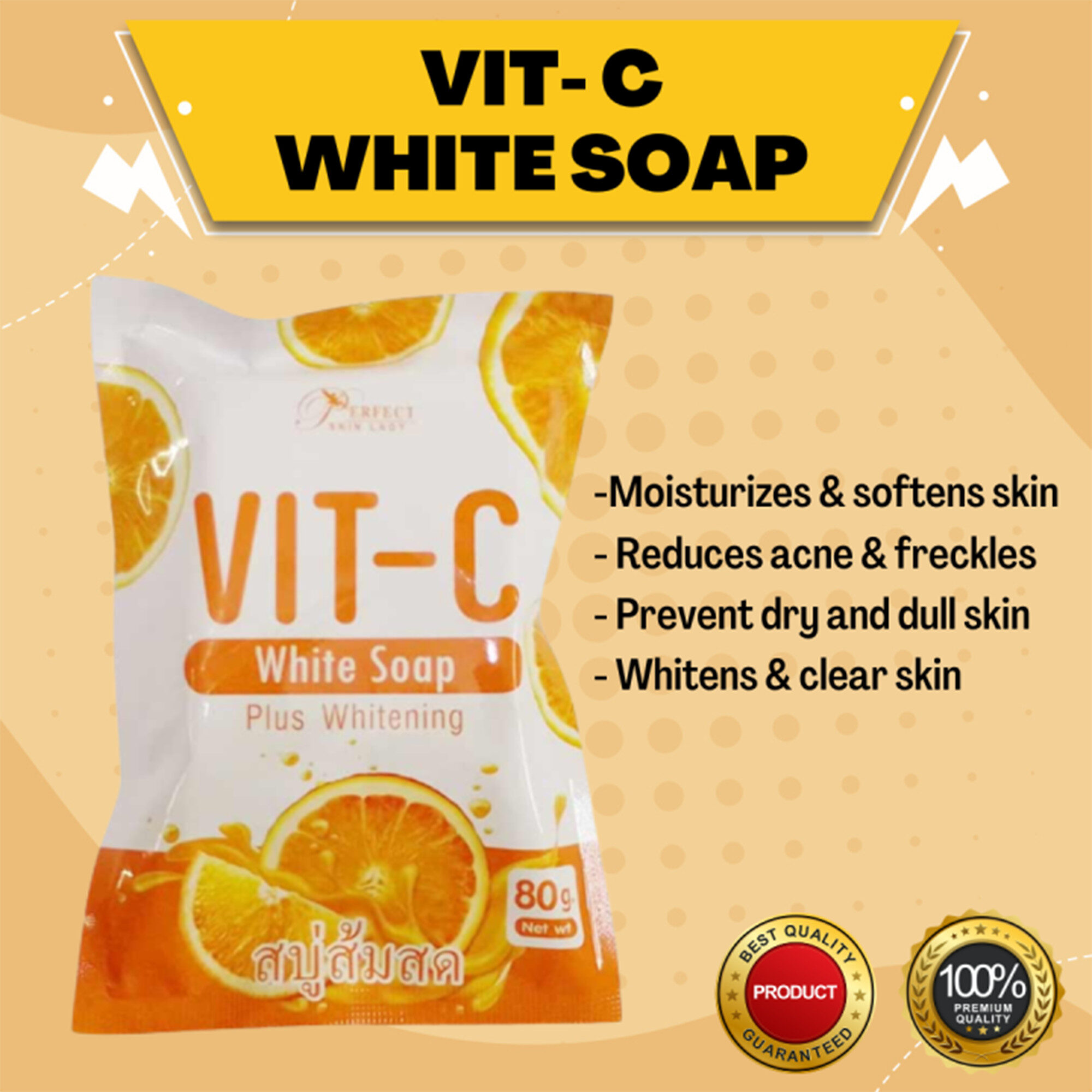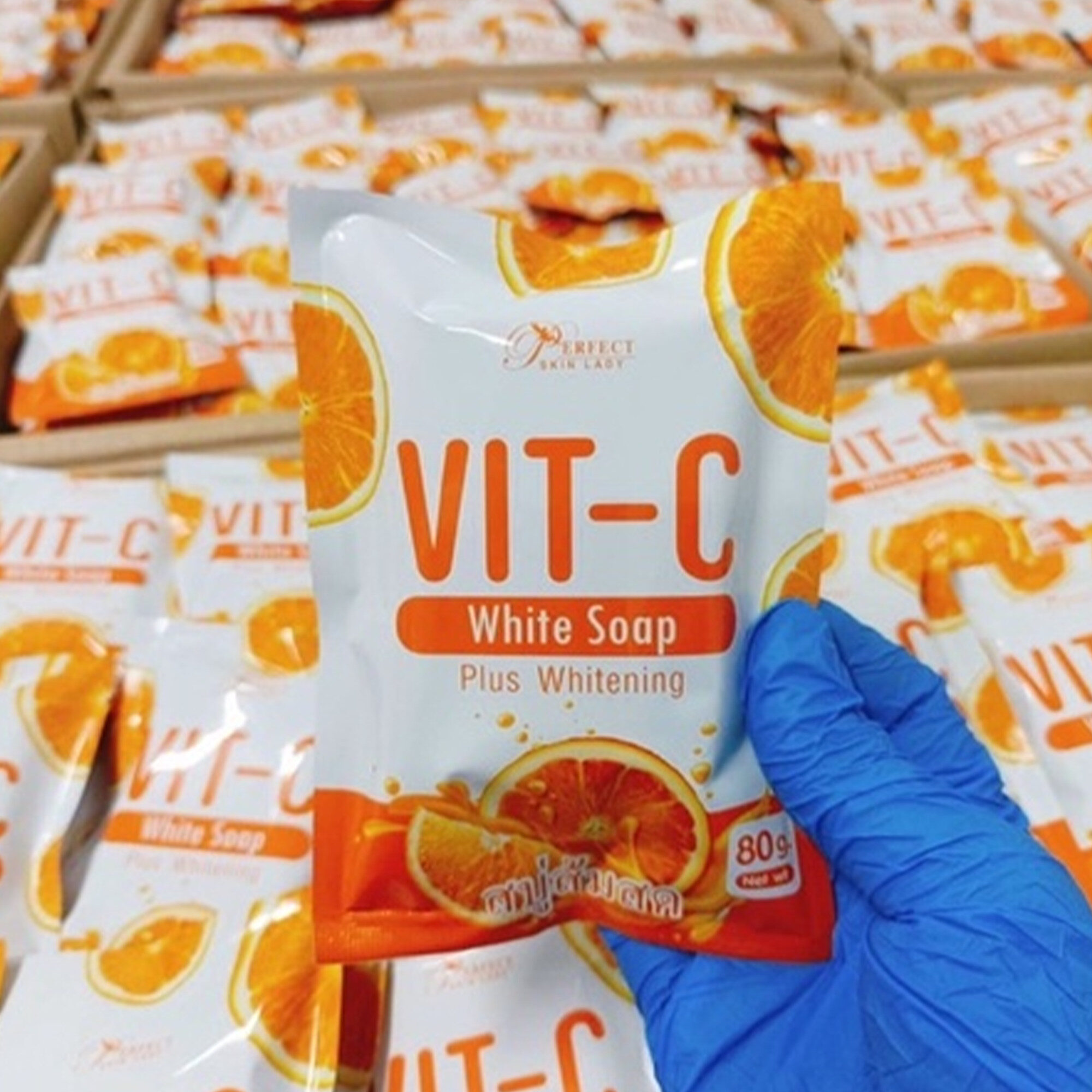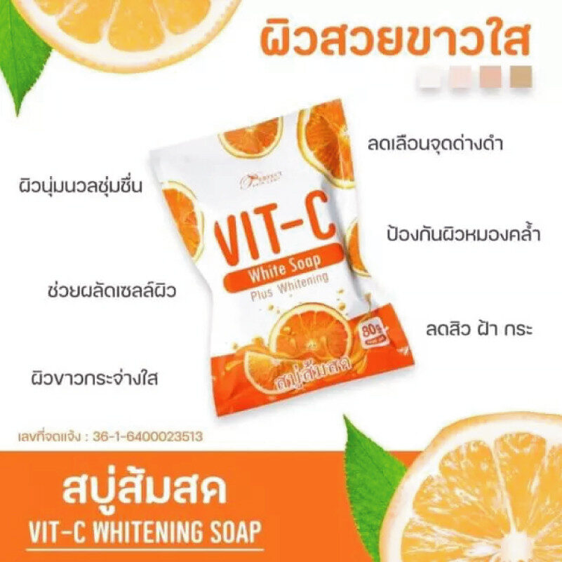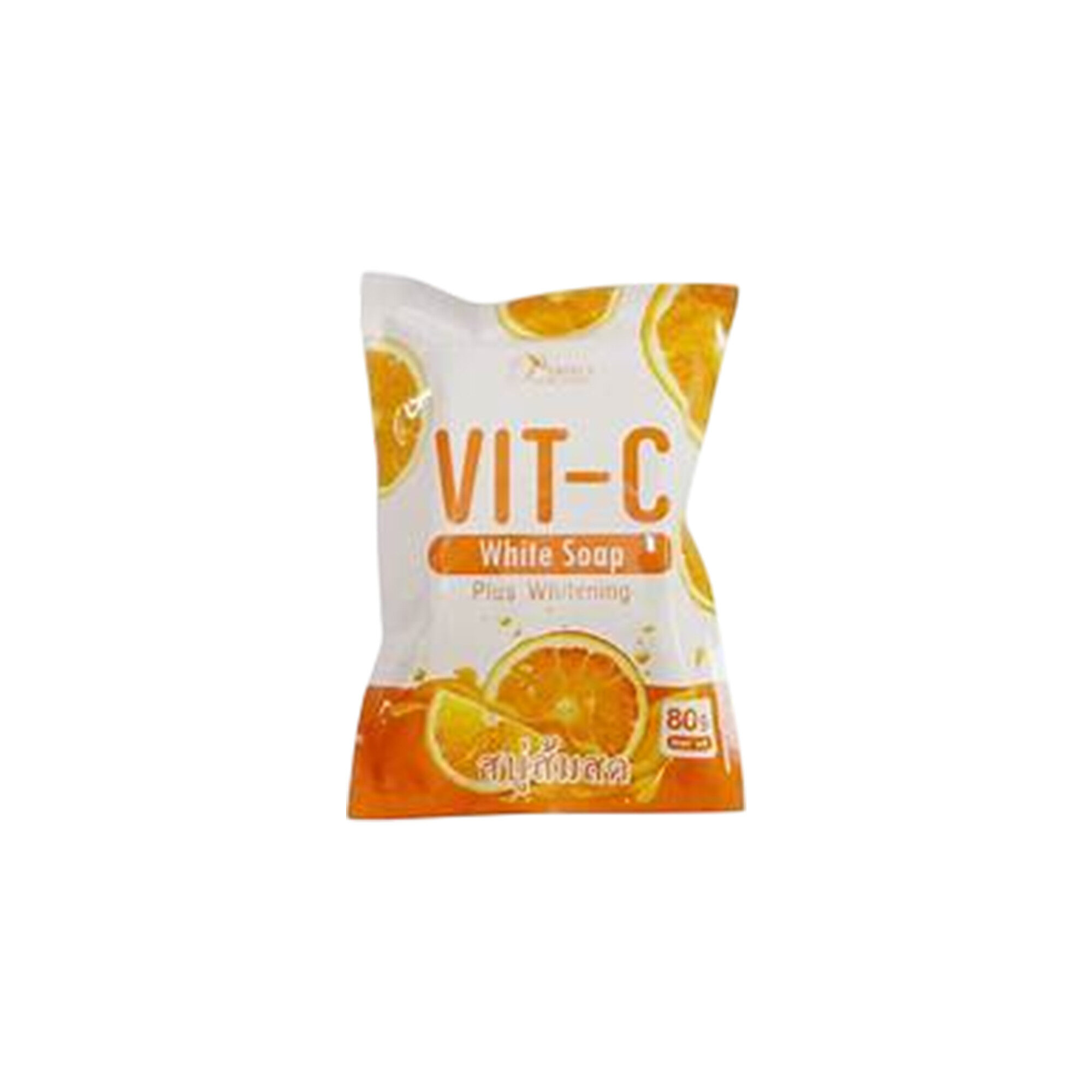 A Vitamin C Whitening Soap Solid Body Bar made in Thailand, designed to gently cleanse and brighten the skin. Enriched with Vitamin C, it helps reduce dark spots, even out skin tone, and restore a radiant, smooth complexion while keeping the skin soft and refreshed.